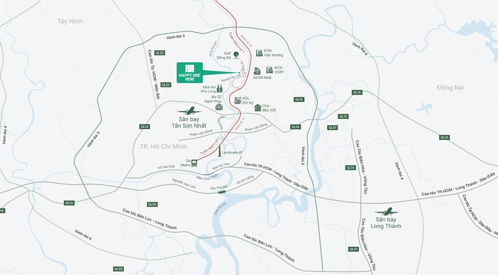 Dự án sở hữu kết nối chiến lược qua Quốc lộ 13, Phạm Văn Đồng, Metro số 2 trong tương lai, giúp di chuyển nhanh về trung tâm TP.HCM và các khu vực trọng điểm. Thiết kế chuẩn Nhật chú trọng không gian xanh, ánh sáng tự nhiên và sự tối ưu công năng, mang lại trải nghiệm sống cân bằng. Nội khu có hơn 68 tiện ích: hồ bơi tràn bờ, công viên, vườn Nhật, gym, spa, khu vui chơi trẻ em, shophouse thương mại… tạo nên một cộng đồng sống hiện đại, khép kín. Với pháp lý sổ hồng lâu dài và thương hiệu uy tín Vạn Xuân Group, Happy One Mori trở thành lựa chọn an cư và đầu tư bền vững tại TP. HCM.